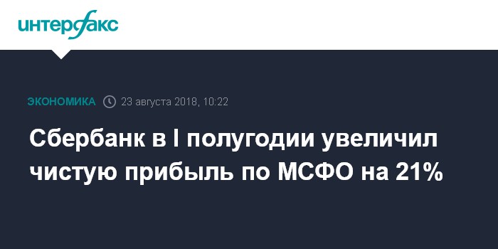 Москва. 23 августа. INTERFAX.RU - Сбербанк России в первом полугодии 2018 года увеличил чистую прибыль по МСФО на 21,4% - до 427,4 млрд рублей по сравнению с 352,2 млрд рублей за аналогичный период 2017 года, следует из отчетности банка.