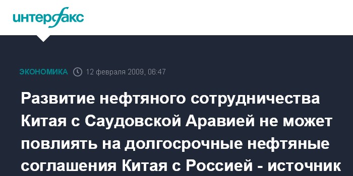 Развитие нефтяного сотрудничества Китая с Саудовской Аравией не может повлиять на долгосрочные нефтяные соглашения Китая с Россией - источник