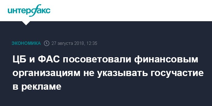 Москва. 27 августа. INTERFAX.RU - ЦБ РФ и Федеральная антимонопольная служба (ФАС) не рекомендуют финансовым организациям указывать в рекламе государственное участие в капитале как преимущество, это может создавать неравные конкурентные условия.