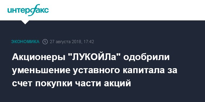 Москва. 27 августа. INTERFAX.RU - Внеочередное собрание акционеров "ЛУКОЙЛа" в заочной форме одобрило уменьшение уставного капитала НК путем приобретения части размещенных акций в целях сокращения их общего количества, говорится в сообщении компании.