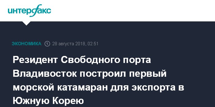 Москва. 28 августа. INTERFAX.RU - Резидент Свободного порта Владивосток (СПВ) ООО "Композитное кораблестроение" построило первый моторный катамаран для экспорта в Республику Корея.
