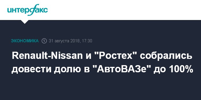Москва. 31 августа. INTERFAX.RU - Совместное предприятие ГК "Ростех" и альянса Renault-Nissan Alliance Rostec Auto B.V. намерено довести свою долю в капитале ПАО "АвтоВАЗ" до 100% в результате оферты и принудительного выкупа акций, после чего возможен делистинг акций "АвтоВАЗа". Об этом сообщил в интервью "Интерфаксу" старший вице-президент группы Renault и руководитель региона Евразия Николя Мор.