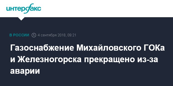 Москва. 4 сентября. INTERFAX.RU - Газоснабжение города Железногорск, Михайловского ГОКа и городской теплосети было прекращено из-за аварии на газопроводе-отводе к газораспределительной станции города Железногорска в Курской области, сообщили "Интерфаксу" источники в отрасли.
