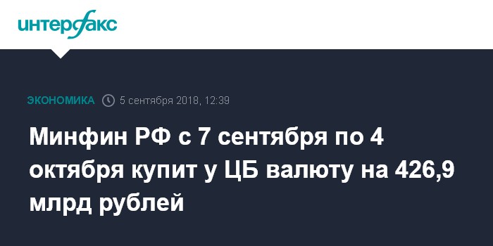 Минфин РФ с 7 сентября по 4 октября купит у ЦБ валюту на 426,9 млрд рублей