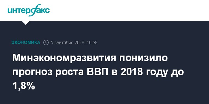 Москва. 5 сентября. INTERFAX.RU - Минэкономразвития понизило прогноз роста ВВП РФ в 2018 году до 1,8% с 1,9% в июльской версии прогноза, в 2019 году до 1,3% с 1,4%. Об этом говорится в опубликованном министерством в среду обзоре "Картина экономики", в котором приводится частично уточненный прогноз до 2024 года.