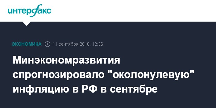 Москва. 11 сентября. INTERFAX.RU - Инфляция в РФ в сентябре 2018 года ожидается в интервале от нуля до 0,1%, в годовом выражении это будет означать ее ускорение до 3,2-3,3% с 3,1% в августе, говорится в обзоре Минэкономразвития "Картина инфляции".