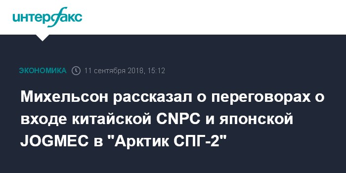 Москва. 11 сентября. INTERFAX.RU - Китайская CNPC обсуждает вхождение в проект "Арктик СПГ 2" на таких же условиях, как и французская Total, сообщил журналистам глава "НОВАТЭКа" Леонид Михельсон.