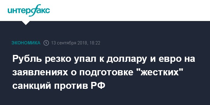 Москва. 13 сентября. INTERFAX.RU - Рубль резко упал к доллару и евро на Московской бирже после появления сообщений о подготовке США "жесткого" пакета санкций, связанного с "делом Скрипалей".