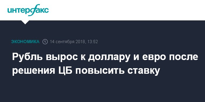 Москва. 14 сентября. INTERFAX.RU - Российский рубль вырос к доллару и евро на Московской бирже днем, отыгрывая решение ЦБ РФ повысить ключевую ставку на 25 базисных пунктов - до 7,5% годовых. Решение ЦБ стало неожиданным для рынка, так как консенсус-прогноз исходил из неизменности ставки. Помимо этого, участники торгов отыгрывают решение регулятора продлить мораторий на покупку валюты в рамках бюджетного правила на открытом рынке до конца года.