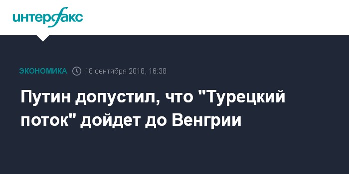 Москва. 18 сентября. INTERFAX.RU - Продолжение газопровода "Турецкий поток" может пройти через Венгрию, сообщил президент России Владимир Путин на совместной пресс-конференции с премьер-министром Венгрии Виктором Орбаном.