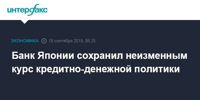 Москва. 19 сентября. INTERFAX.RU - Банк Японии не стал менять основные параметры кредитно-денежной политики по итогам двухдневного заседания, завершившегося в среду.
