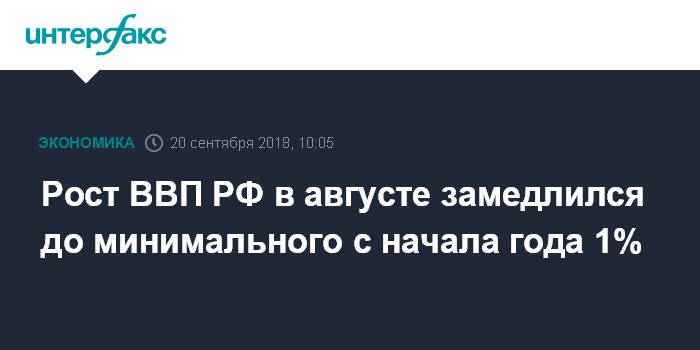 Годовые темпы роста экономики в августе замедлились до минимальных значений с начала года - до этого минимальный рост фиксировался в январе и июне - на 1,1%. В целом за январь-август 2018 года рост оценивается ведомством на уровне 1,6%.