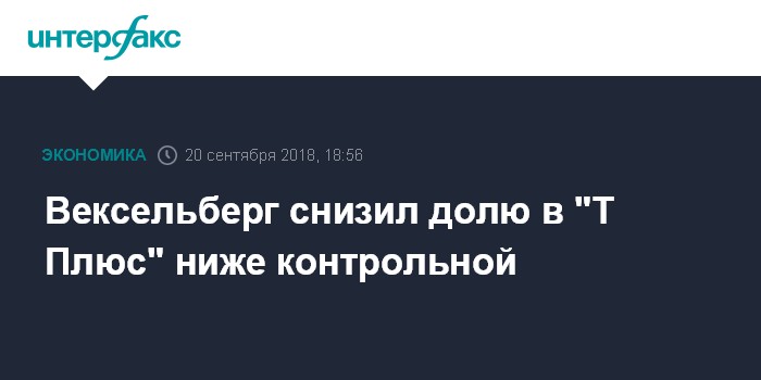 Москва. 20 сентября. INTERFAX.RU - Доля принадлежащих Виктору Вексельбергу структур в уставном капитале ПАО "Т Плюс" снизилась с 57,1% до 39,59%, сообщила теплогенерирующая компания.