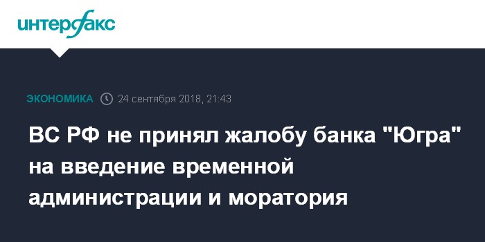ВС РФ не принял жалобу банка "Югра" на введение временной администрации и моратория
