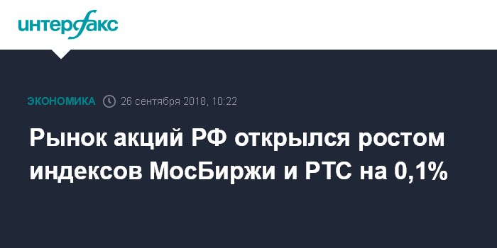 Москва. 26 сентября. INTERFAX.RU - Рынок акций РФ на старте торгов в среду сохранил восходящую динамику на фоне дорогой нефти и позитивной динамики азиатских фондовых площадок; индексы МосБиржи и РТС за минуту торгов прибавили по 0,1%, причем первый обновил свой максимум.