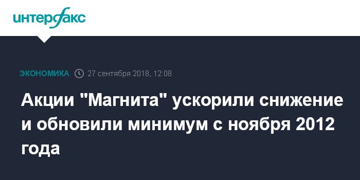 Москва. 27 сентября. INTERFAX.RU - Акции "Магнита" днем в четверг ускорили снижение и обновили минимумы с ноября 2012 года, второй день подряд выступая лидерами отката среди blue chips при отсутствии очевидных причин для такого движения.