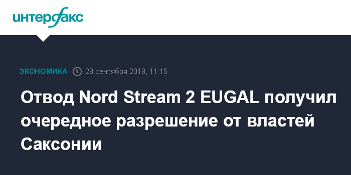 Москва. 28 сентября. INTERFAX.RU - Сухопутный отвод от морской магистрали "Северный поток 2" EUGAL получил от властей Саксонии второе необходимое разрешение на строительство магистрали, сообщает газотранспортная компания Gascade.