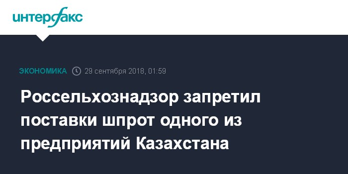 Москва. 29 сентября. INTERFAX.RU - Россельхознадзор с субботы, 29 сентября запрещает поставки рыбных консервов с казахстанского ТОО "J.F.M. company".