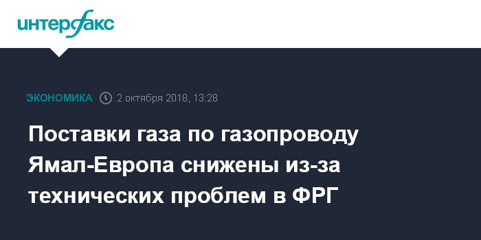 Москва. 2 октября. INTERFAX.RU - Поставки газа в Европу по газопроводу Ямал-Европа во вторник утром снизились из-за проблем на компрессорной станции Мальнов на востоке ФРГ, сообщает газотранспортная компания Gascade.