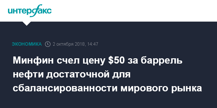 Москва. 2 октября. INTERFAX.RU - Цена на нефть в районе $50 за баррель достаточна для сбалансированности мирового рынка, полагают в Минфине РФ.