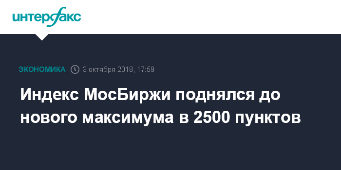 Москва. 3 октября. INTERFAX.RU - Индекс МосБиржи, один из основных российских фондовых индикаторов, к вечеру среды достиг круглой отметки 2500 пунктов, в очередной раз обновив исторический максимум на фоне подъема мировых фондовых площадок и нефти.