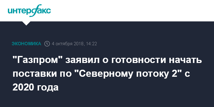 Москва. 4 октября. INTERFAX.RU - "Газпром" готов начать поставки газа по "Северному потоку 2" с 1 января 2020 года, сообщил глава "Газпрома" Алексей Миллер, выступая на пленарном заседании Петербургского международного газового форума.