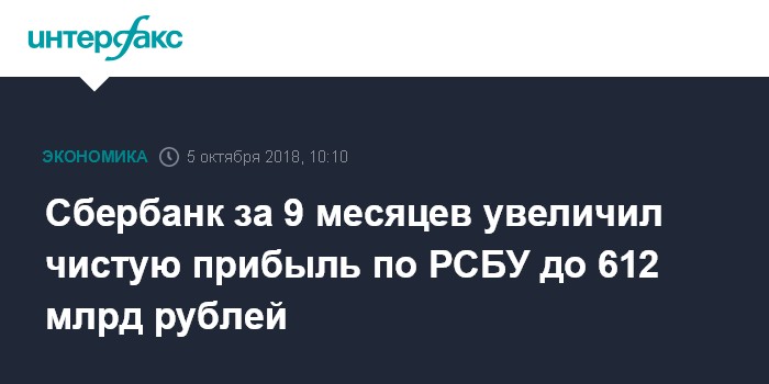 Москва. 5 октября. INTERFAX.RU - Сбербанк России за январь-сентябрь 2018 года увеличил чистую прибыль по РСБУ по сравнению с аналогичным периодом прошлого года на 23,6% - до 612,7 млрд рублей, говорится в пресс-релизе кредитной организации.