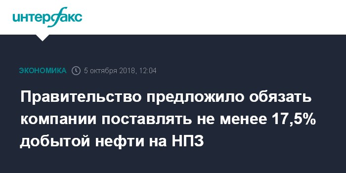 Москва. 5 октября. INTERFAX.RU - Правительство предложило обязать все нефтяные компании поставлять на нефтеперерабатывающие заводы не менее 17,5% добываемой нефти, говорится в решениях по итогам совещания премьер-министра РФ Дмитрия Медведева с нефтяными компаниями о развитии нефтяной отрасли, состоявшегося 18 сентября.