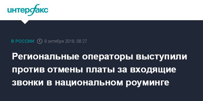 Москва. 8 октября. INTERFAX.RU - Региональные операторы связи обратились к правительству РФ с письмом о негативных последствиях отмены тарификации входящих звонков в национальном роуминге, пишет в понедельник газета "Коммерсантъ" со ссылкой на два источника на рынке.
