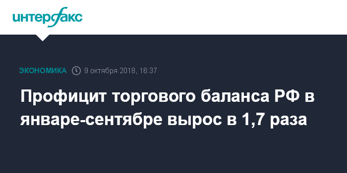 Москва. 9 октября. INTERFAX.RU - Положительное сальдо внешней торговли РФ в январе-сентябре 2018 года увеличилось в 1,7 раза, до $136,3 млрд, по сравнению с $80,4 млрд за аналогичный период 2017 года. Об этом сообщается в оценке платежного баланса, опубликованной на сайте ЦБ РФ.