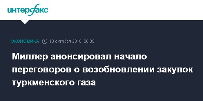 Москва. 10 октября. INTERFAX.RU - Сложившаяся в настоящее время конъюнктура предоставляет хорошие возможности для возобновления закупок туркменского газа, заявил председатель правления ПАО "Газпром" Алексей Миллер в интервью туркменскому телеканалу "Ватан", которое транслировалось в среду утром.