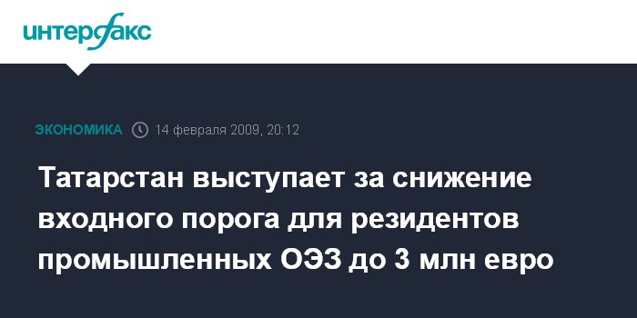 Казань. 14 февраля. ИНТЕРФАКС-ПОВОЛЖЬЕ - Татарстан выступает за снижение требований к минимальному объему инвестиций в проекты в Особых экономических зонах (ОЭЗ) промышленно-производственного типа с 10 млн до 3 млн евро.