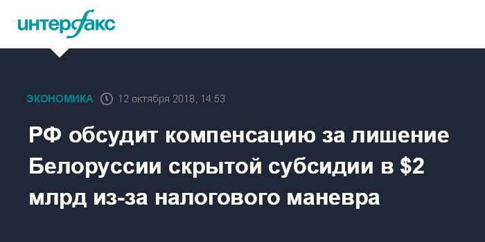 "Действительно, при реализации налогового маневра наши партнеры, Белоруссия, будут сокращать поступления скрытой субсидии, которую мы предоставляем в результате отсутствия экспортной пошлины на нефть и нефтепродукты. Общий объем этой субсидии в целом сегодня составляет $2 млрд в год", - заявил Силуанов журналистам в Могилеве.
