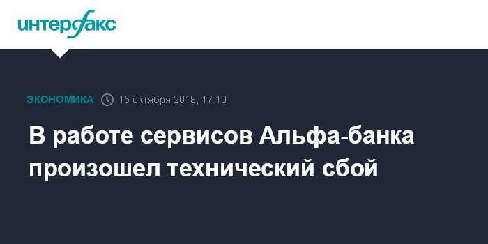 Москва. 15 октября. INTERFAX.RU - В Альфа-банке произошел технический сбой, который коснулся работы мобильного банка, онлайн-банка и колл-центра, рассказали "Интерфаксу" два клиента банка.