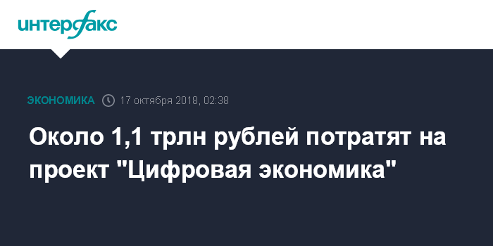 Москва. 17 октября. INTERFAX.RU - На шестилетний проект "Цифровая экономика" будут выделены 1,08 трлн рублей до 2024 года, сообщает в среду газета "Коммерсант".
