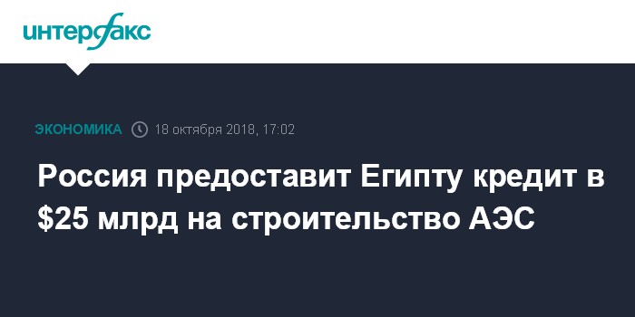 Москва. 18 октября. INTERFAX.RU - Россия выделит кредит в $25 млрд на строительство АЭС в Египте, сообщил президент РФ Владимир Путин на заседании дискуссионного клуба "Валдай" в Сочи в четверг.