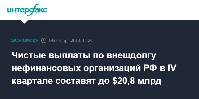 Москва. 19 октября. INTERFAX.RU - Чистые выплаты по внешнему долгу российских нефинансовых организаций, включая основной долг и проценты, в четвертом квартале 2018 года могут составить до $20,8 млрд. В то же время, по данным макростатистики, они оцениваются в $21,8 млрд, сообщается на сайте ЦБ РФ.