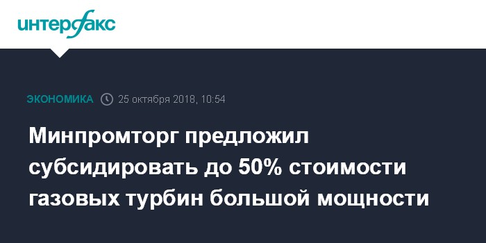 Москва. 25 октября. INTERFAX.RU - Минпромторг РФ предложил субсидировать до 50% стоимости производства российских газовых турбин большой мощности. Это следует из опубликованного в четверг на портале regulation.gov проекта постановления правительства о предоставлении российским организациям субсидий на проведение научно-исследовательских, опытно-конструкторских и технологических работ в рамках создания производства газовых турбин большой мощности.