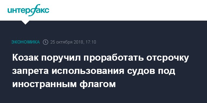 Москва. 25 октября. INTERFAX.RU - Вице-премьер правительства РФ Дмитрий Козак поручил Минэнерго совместно с "НОВАТЭКом" проработать вопрос об отсрочке запрета на использование судов под иностранным флагом.