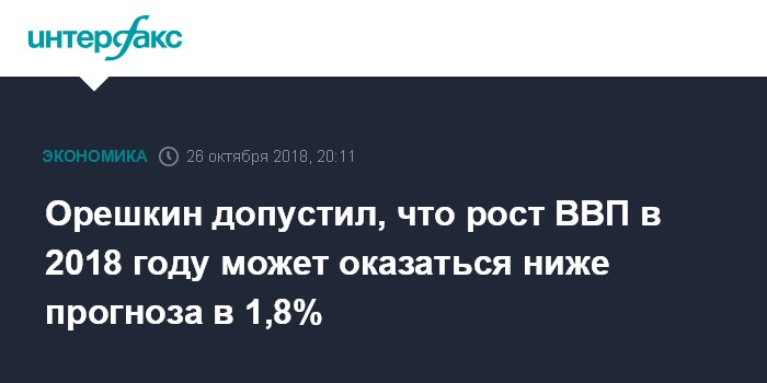Москва. 26 октября. INTERFAX.RU - Глава Минэкономразвития РФ Максим Орешкин допустил, что рост ВВП РФ в 2018 году может оказаться ниже официального прогноза в 1,8% и оказаться в интервале от 1,5% до 2%.