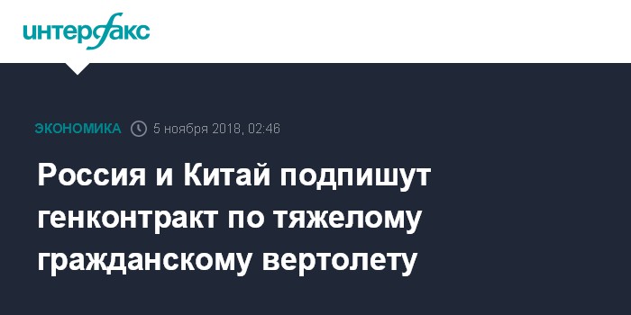 Москва. 5 ноября. INTERFAX.RU - АО "Вертолеты России" (входит в "Ростех") и китайская компания Avicopter в ходе встречи глав правительств России и Китая 7 ноября намерены подписать генеральный контракт по созданию тяжелого гражданского вертолета, сообщил первый замглавы аппарата правительства РФ Сергей Приходько.