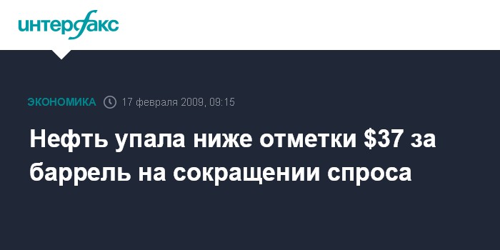 Москва. 17 февраля. INTERFAX.RU - Цена нефти упала ниже отметки $37 за баррель на сокращении спроса на топливо из-за спада в мировой экономике, сообщило агентство Bloomberg.