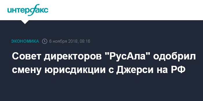 Москва. 6 ноября. INTERFAX.RU - Совет директоров "РусАла" одобрил реализацию плана по смене юрисдикции компании с острова Джерси в РФ, говорится в сообщении компании.