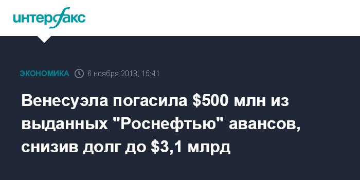 Как сообщалось, всего "Роснефть" выдала Венесуэле в качестве предоплат $6,5 млрд. "Все деньги возвращаются в соответствии с контрактными обязательствами", - говорил вице-президент НК по переработке, нефтехимии, коммерции и логистике Дидье Касимиро.