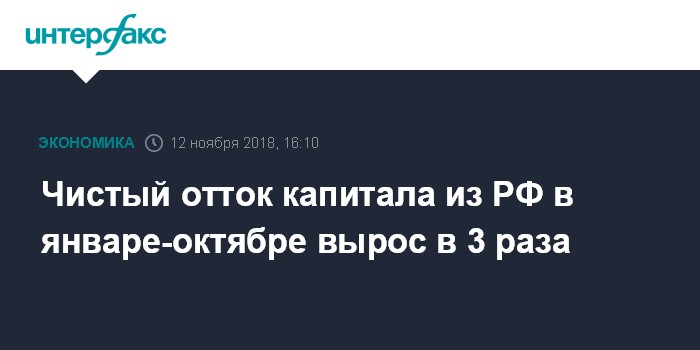 Москва. 12 ноября. INTERFAX.RU - Чистый отток капитала из РФ в январе-октябре 2018 года вырос в 3 раза, до $42,2 млрд, по сравнению с аналогичным периодом 2017 года, когда он составил $14,0 млрд, свидетельствуют материалы Банка России.