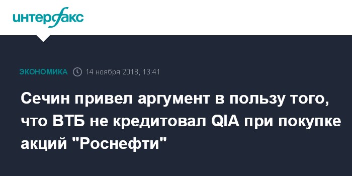 "Он (ВТБ - ИФ) не кредитовал QIA", - сказал Сечин журналистам в Сингапуре, отвечая на соответствующий вопрос телеканала "Дождь".