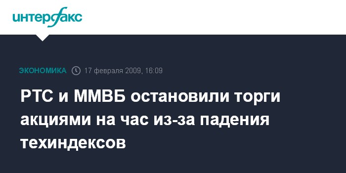 Москва. 17 февраля. INTERFAX.RU - Фондовые биржи РТС и ММВБ приостановили во вторник торги всеми акциями с 16:05 МСК на час из-за падения техиндексов более чем на 5%.