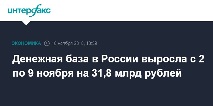 На 2 ноября денежная база в России равнялась 10270,2 млрд рублей. Таким образом, за период она выросла на 0,31%, или на 31,8 млрд рублей.