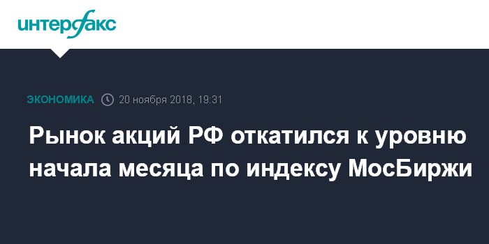 Москва. 20 ноября. INTERFAX.RU - Рынок акций РФ во вторник упал к уровню начала ноября по индексу МосБиржи (к 2340 пунктам) на фоне негативной динамики мировых фондовых площадок из-за сокращения спроса на рисковые активы в условиях опасений торможения мировой экономики, а также на фоне обвалившейся нефти; лидерами отката выступили бумаги "Мобильных телесистем" на новостях о создании финрезервов.