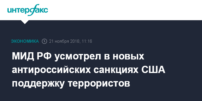 Москва. 21 ноября. INTERFAX.RU - Новые антироссийские санкции США выглядят как заявление о поддержке террористов в Сирии и стремление препятствовать восстановлению этой страны, заявили в среду в МИД России.